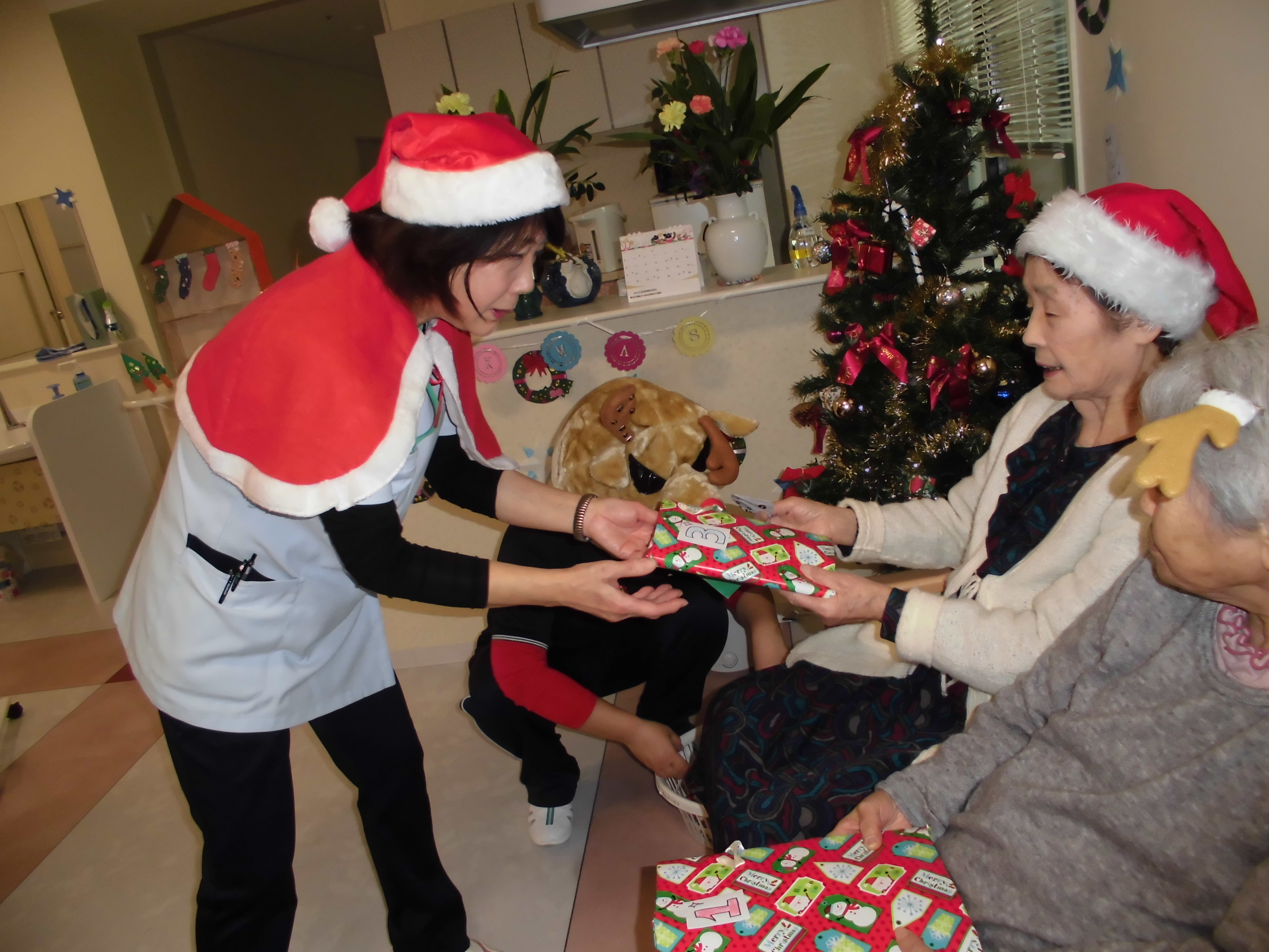 12月25日、デイサービス悠里でもクリスマス会を行いました。 サンタやトナカイに扮したスタッフたちの歌とダンスでにぎやかに始まりました。利用者の皆様も、サンタの衣装やトナカイの飾りをつけて、にっこり笑顔。 最後は皆でケータリングゲームをして大いに盛り上がりました!