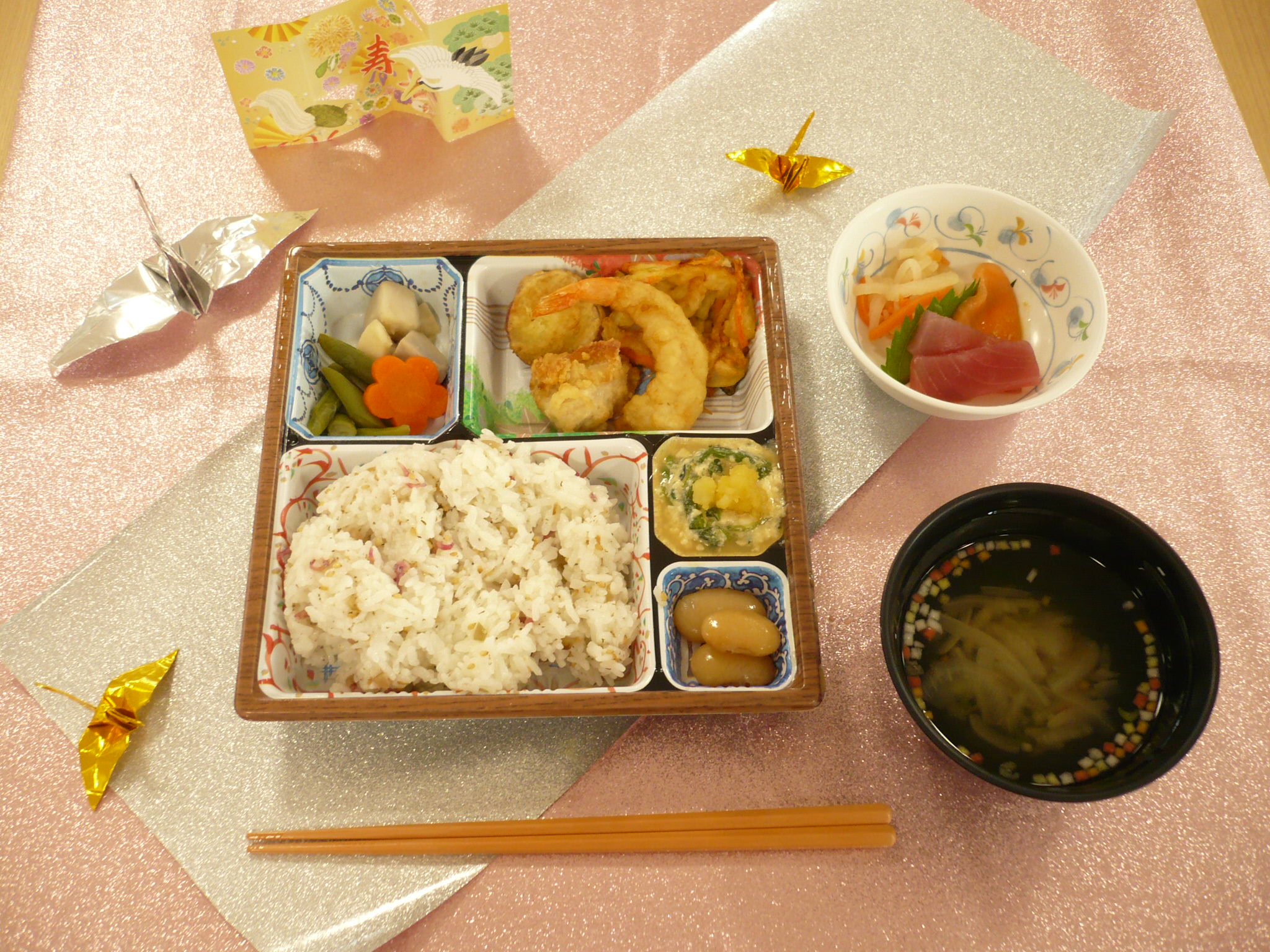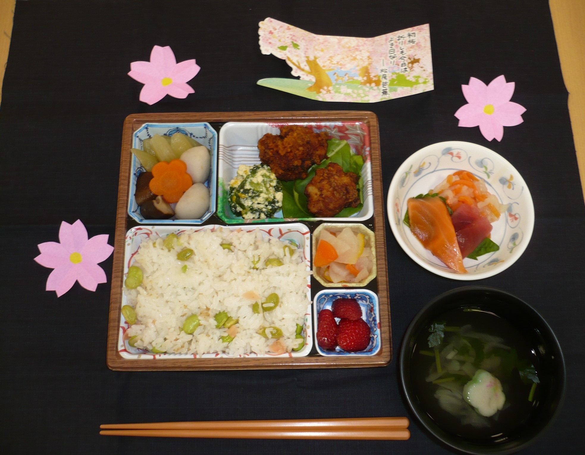 毎日のお食事は大切ですよね。たくさんのご入所者様が、毎日のお食事を楽しみにされています。中でも、イベントの時の献立は楽しみも喜びもひとしおです。今回は、皆様に良かった~と言っていただけたお食事を一部ご紹介! これは、4月にご用意したお花見弁当です。